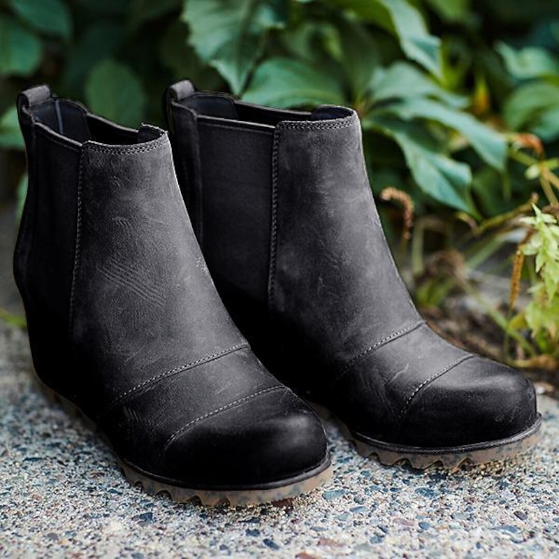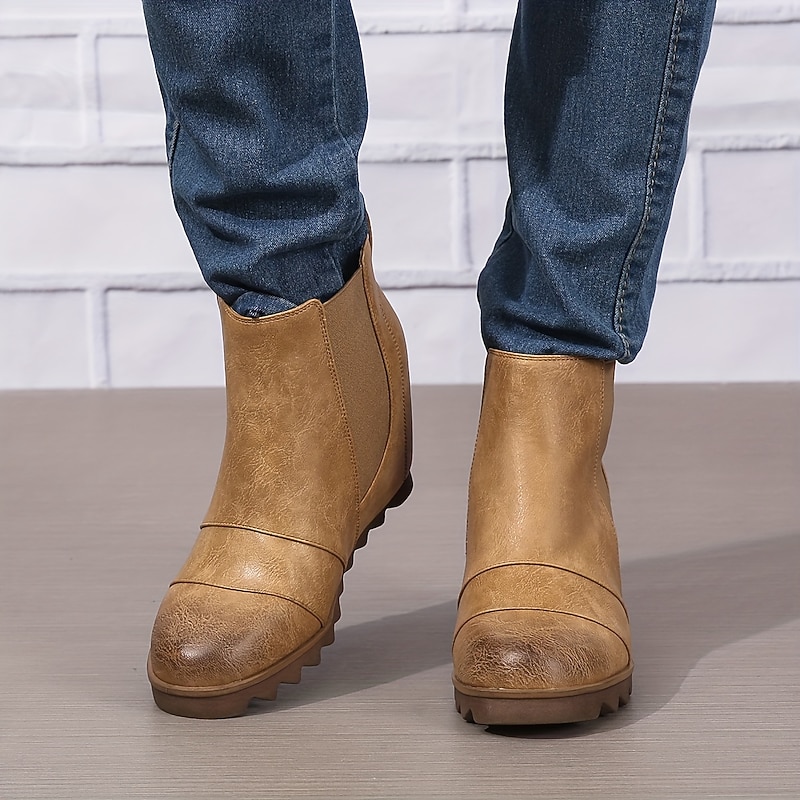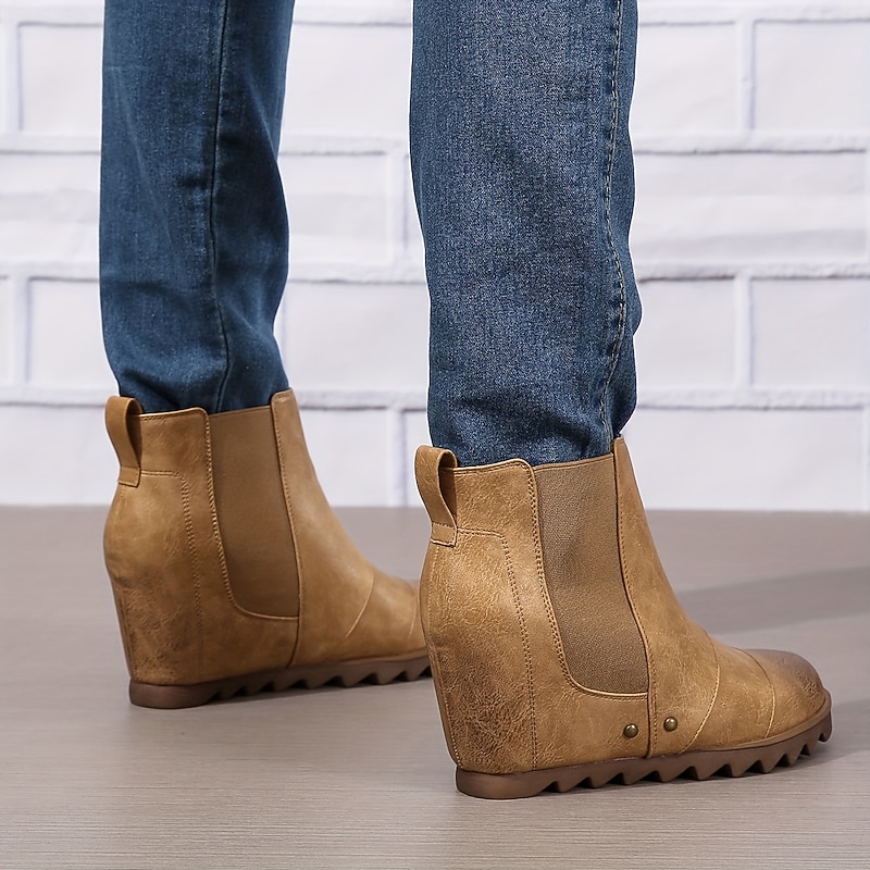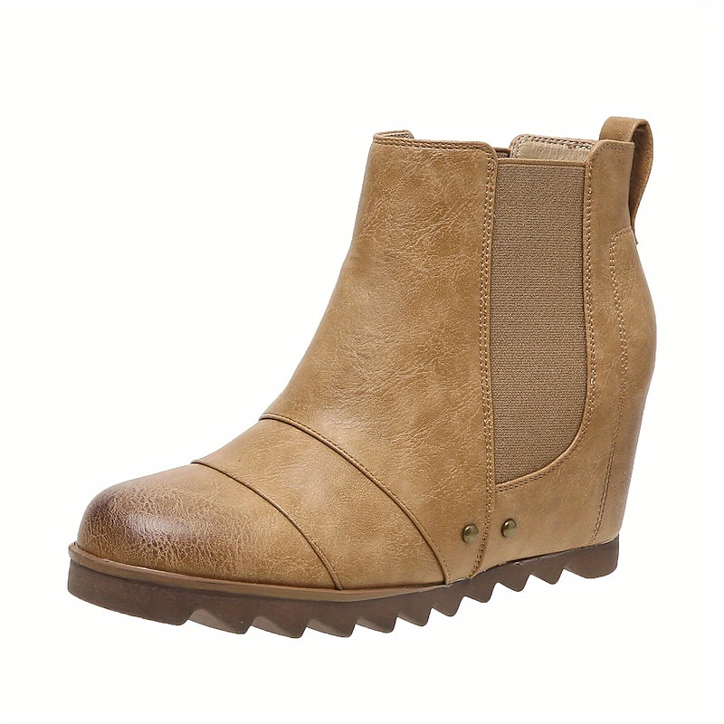 Highlights [Fabric] Crafted from premium PU material, these ankle boots offer the look and feel of real leather, ensuring durability and a refined appearance. [Silhouette] Designed as wedge ankle booties, these shoes combine fashion with functionality, providing a subtle lift and all-day comfort. The hidden heel adds elegance without sacrificing ease of wear. [Design Highlights] Featuring elastic side panels, these boots allow for effortless slip-on access while maintaining a snug, comfortable fit. The rugged soles come with deep tread patterns, ensuring excellent grip on both urban and outdoor terrains. [Occasions] Ideal for everyday wear and adventurous outings, these versatile boots are perfect for fall and winter seasons. Their classic design in brown, black, and khaki colors complements a wide range of outfits, making them suitable for both casual and minimalistic styles. [Size Range] Available in a variety of sizes from US5.5 to US10.5, EU35 to EU42, these boots cater to diverse foot sizes, ensuring a perfect fit for every woman.