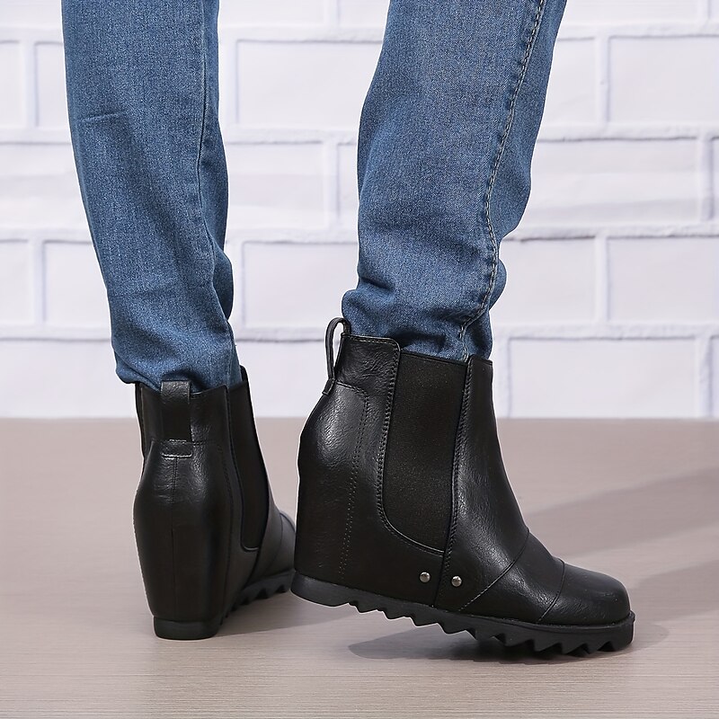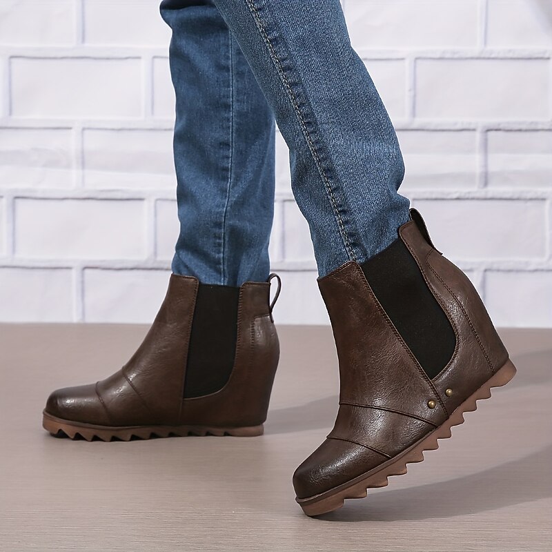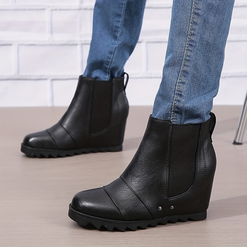 HOT ! Women's Wedge Ankle Boots with Elastic Panels – Stylish Faux Leather Slip-On Booties