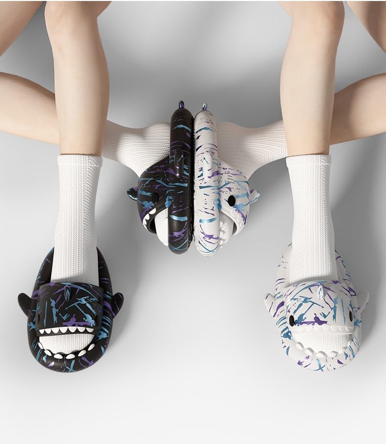 • 【Upgraded EVA Material 】Crafted with the utmost care, these shark slides are made from healthy EVA material with no odor, ensuring a safe and environmentally friendly product. The soft and squishy texture of the shark slippers provides an unparalleled sensation, making each step feel like walking on clouds. The quick rebound feature adds an extra spring to your stride, enhancing your walking experience.