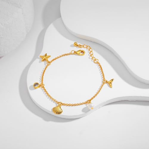 • Dainty Gold Chain Starfish Shell Bracelet: Wherever you go, you can bring beautiful beaches with this stunning gold chain starfish shell charm bracelet. With its delicate gold chain interwoven with striking starfish and shell-pearl rhinestones, this bracelet brings a seaside charm.