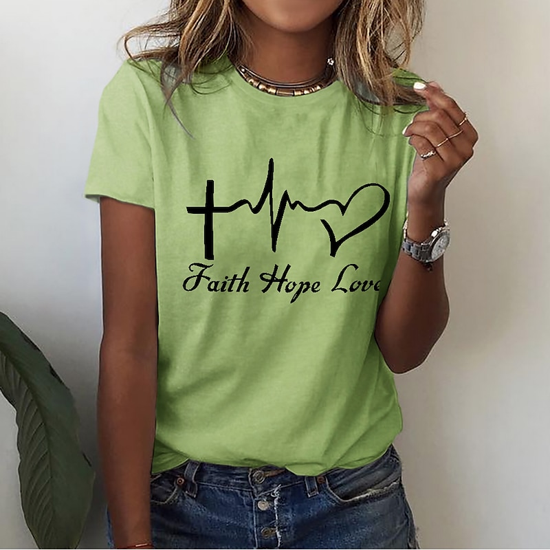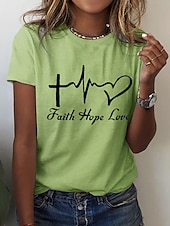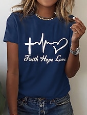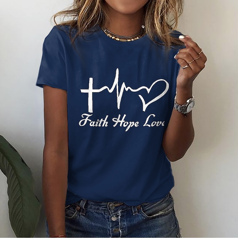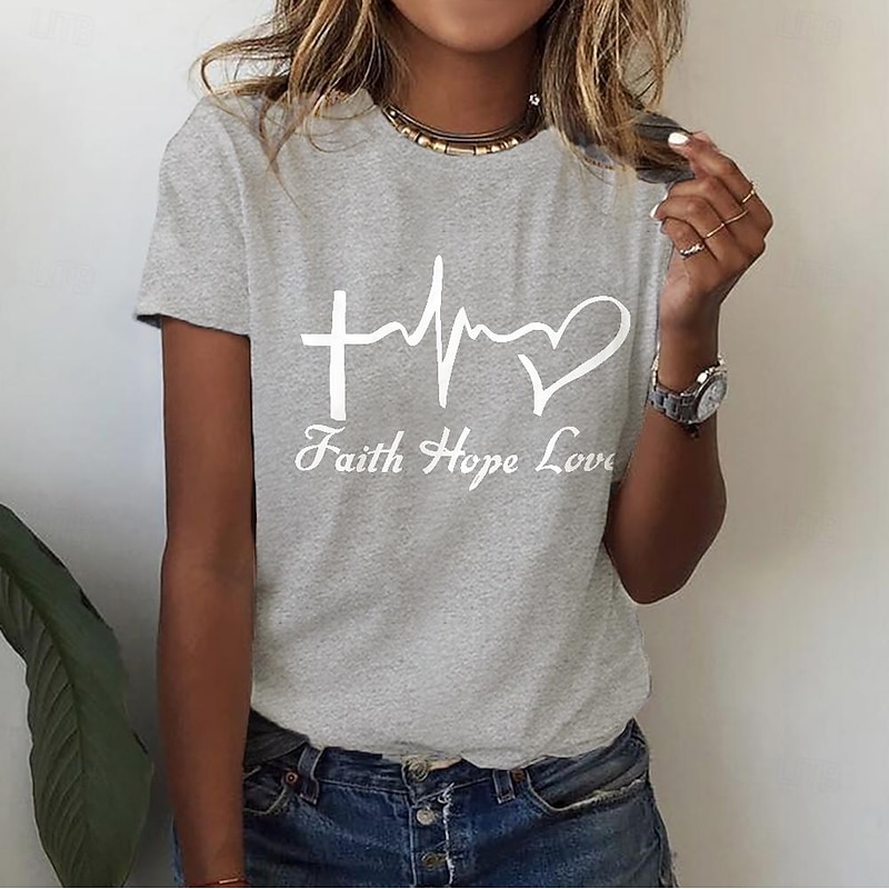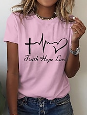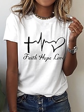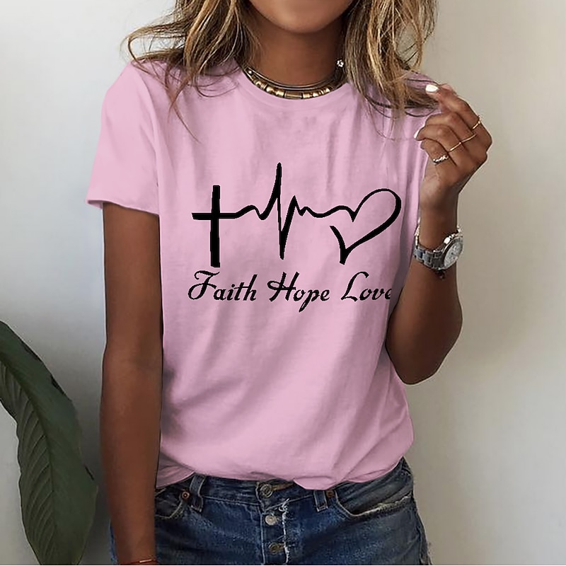 Highlights [Fabric] : Crafted from 100% high-quality cotton, this women's T-shirt offers a soft and breathable experience, ensuring comfort and durability for everyday wear. [Fit] : The T-shirt features a regular fit with a classic round neckline and short sleeves, providing a relaxed, laid-back style that pairs perfectly with jeans or shorts. [Design Highlights] : Adorned with a meaningful print that includes a heart, letter symbols, a cross, a heartbeat, and a heart shape, this T-shirt expresses positivity and inspiration through its artistic design. [Occasions] : Ideal for casual outings, weekend adventures, and summer activities, this T-shirt effortlessly combines style with comfort, making it a versatile choice for a variety of occasions. [Size Range] : Available in sizes S, M, L, XL, 2XL, and 3XL, ensuring a suitable fit for a wide range of body types. For the best fit, it is suggested to select two sizes larger than your usual size.