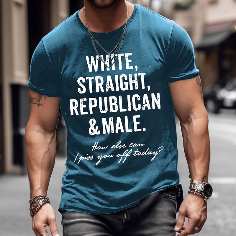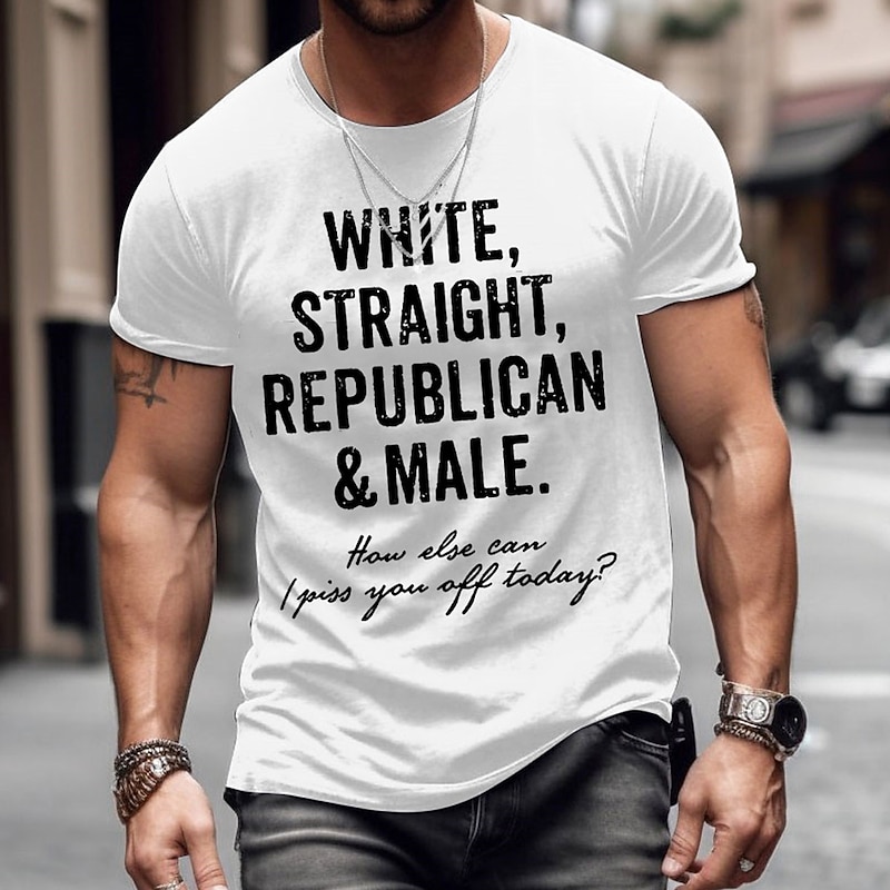 Men's T-Shirt, Short Sleeve Graphic Tee with 'White, Straight, Republican & Male. How Else Can I Piss You Off Today?' Provocative Lifestyle Slogan 1
