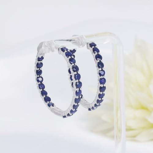 Item width: 30 millimetersMaterial: GemstoneMetal type: Rhodium-plated-silverBack Finding: Push BackEarring design: HoopGem type: Blue sapphireRhodium Plated Sparkle - Our hoop earrings feature a tennis-style eternity design. Made of 925 sterling silver, these eternity earrings showcase 40 colored round Natural Blue Sapphire gemstones in a prong setting, creating a dazzling accessory that makes you stand out from the crowd.Effortless Elegance - Enjoy the convenience of our easy lock push back closure, making our women's jewelry not only stunning but also easy to wear. The secure closure complements the design, ensuring your earrings stay in place while you move through your day.Gorgeous Fashion Statement - Make a bold fashion statement with rhodium plated sterling silver earrings. The polished finish adds a dazzling touch to any outfit, providing a gorgeous yet classy accessory for women and girls who appreciate fine jewelry.Trendsetting Affordability - Stay on-trend without breaking the bank. These women's earrings combine fashion-forward design with budget-friendly pricing, giving you a brilliant piece of fine jewelry that won't compromise on style.Thoughtful Keepsake - Gift a vibrant and colorful keepsake with our crystal earrings for women. Ideal for mothers, friends, girlfriends, wives, or daughters-in-law, this accessory is ideal for special occasions, from proms and weddings to graduations and birthdays. excellent for everyday use. superior materials and excellent craftsmanship ensure long-lasting durability.