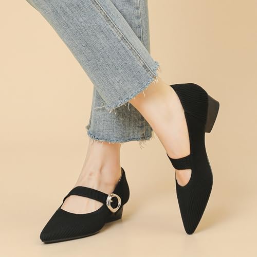 Women's Knit Low Chunky Block Heel Mary Jane Pumps with Adjust Metal Buckle Strap Fashion Closed Pointed Toe Shallow Mouth Slip On Heels cushy Casual Business Dress Shoes