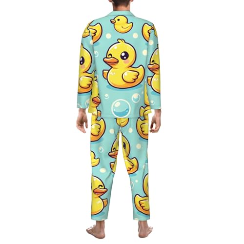 Mens Long Sleeves Pajama Set Cute Yellow Rubber Ducks Light Blue Cozy Two-Piece Loungewear For Nighttime Comfort,Casual Wear