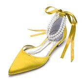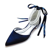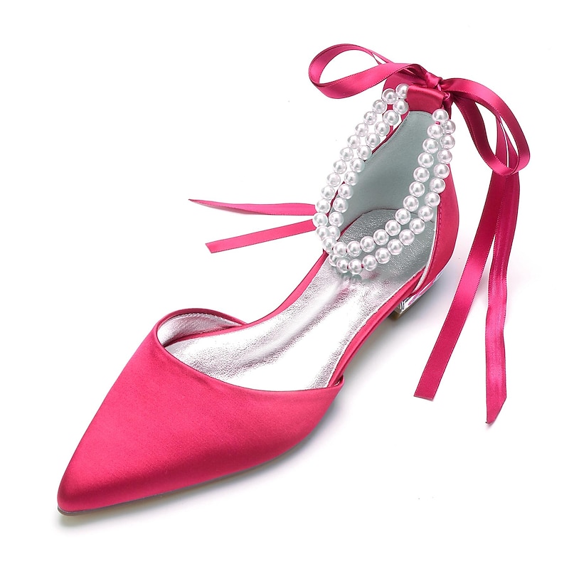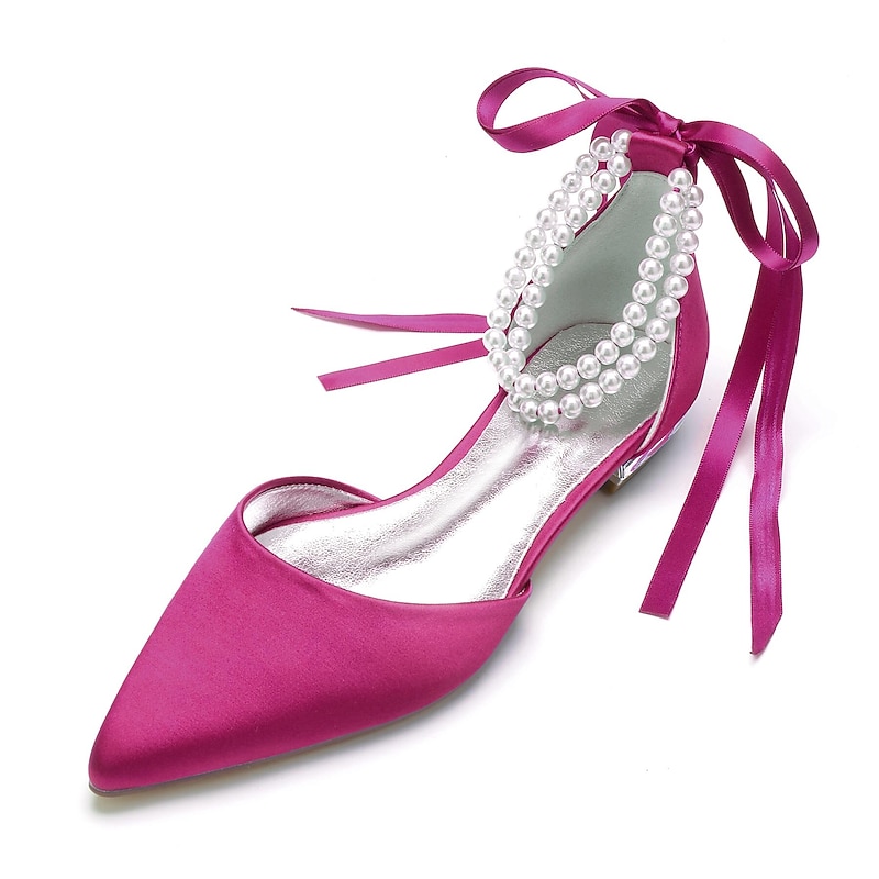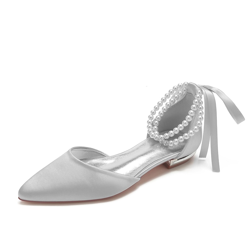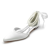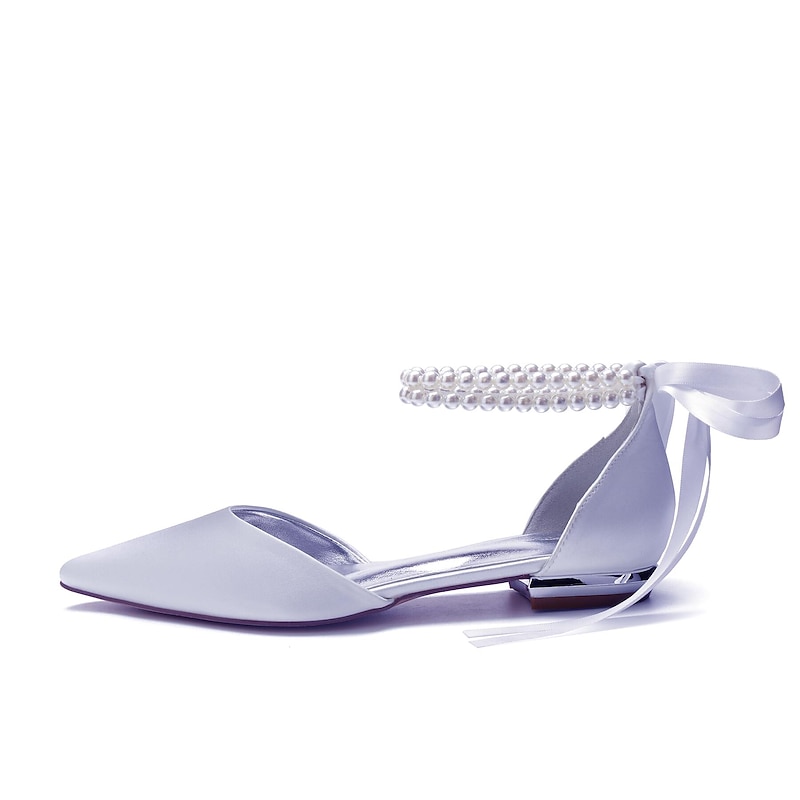 More information about White Satin Flat Wedding Shoes with Pointed Toe, Pearl Chain Ankle Strap, and Ribbon Detail for Bridal Occasions