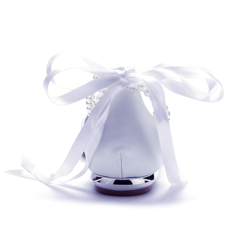 The shoes are embellished with charming bowknots and delicate imitation pearls around the ankle strap, adding a timeless, glamorous touch. The satin ribbon ankle tie can be fashioned into a beautiful bow, ensuring a secure and fashionable fit for various events.