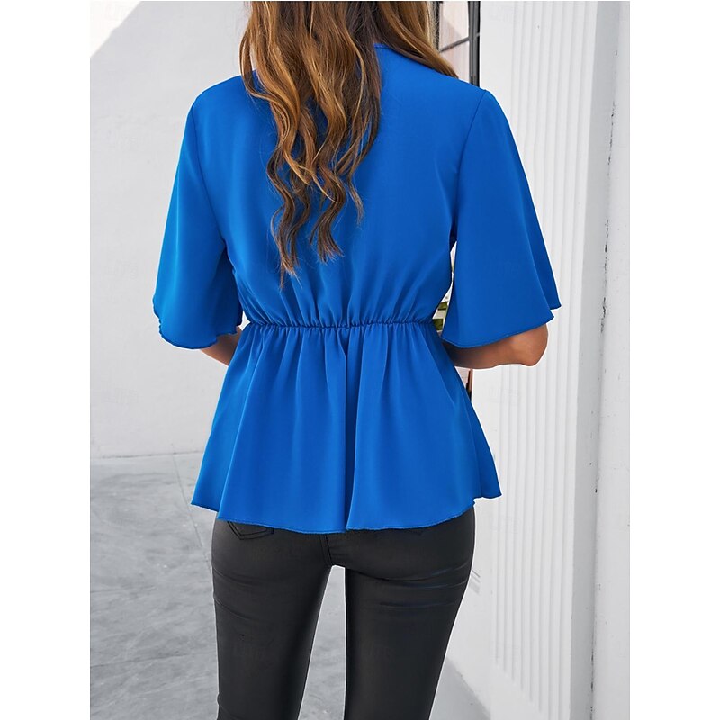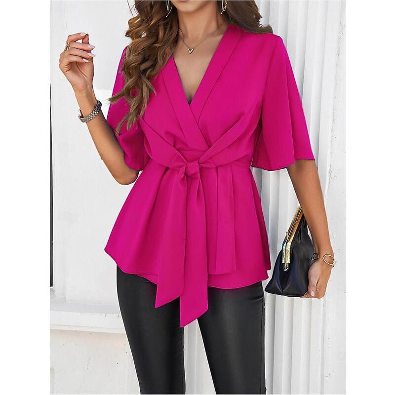 Women's Shirt Dressy Tops Solid Color Plain Elegant new-age Half Sleeve V Neck Work Daily Tie Front Ruched Black White Royal Blue Rose Pink Summer Spring Fall