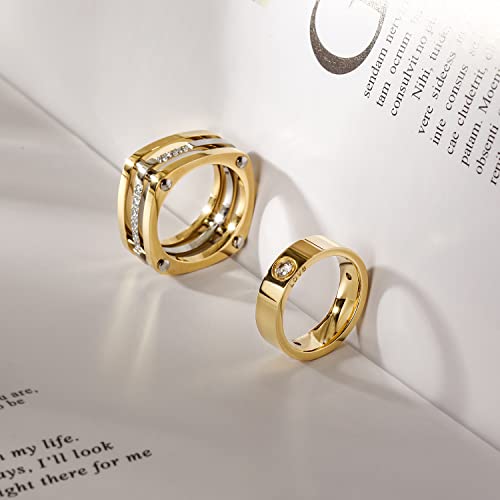 HOT ! 14K Gold Plated Band Rings for Women, Solitaire Rings with CZ, 316L Stainless Steel Chunky Cubic Zirconia Enhancer Ring, Trendy LOVE Engraved Rings