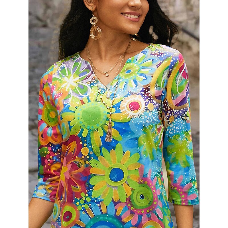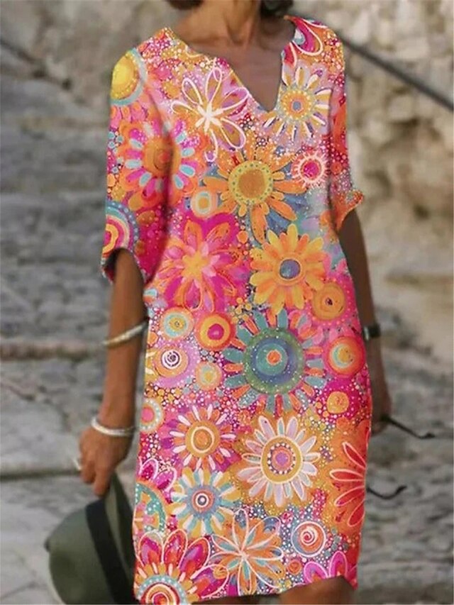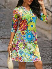 Highlights [Fabric] : Made from high-quality polyester, this dress offers a lightweight, breathable experience that is perfect for spring and summer days. Its micro-elasticity ensures a soft fit that moves with you, providing ease without compromising on style. [Silhouette] : This dress features a shift dress design with a relaxed, straight silhouette that falls gracefully to a midi length. It provides a regular fit that suits a wide range of body types, ensuring both style and practicality for everyday wear. [Design Highlights] : The dress showcases a vibrant floral print, combining a spectrum of bright hues like green, pink, and yellow for a bold effect. The split neckline adds a sophisticated touch, paired with three-quarter length sleeves that make it versatile for various occasions. The cheerful design and striking colors make it a fashion-forward choice. [Occasions] : Whether youβre going on a casual date, heading out for a weekend adventure, or simply enjoying a day out, this dress is ideal for multiple settings. Its active, fashion-forward style makes it suitable for daily wear or more festive outings. [Size Range] : Available in sizes S, M, L, XL, and XXL, this dress caters to a broad spectrum of body types, providing a comfortable and flattering fit for many. Perfect for everyday use. superior materials and excellent craftsmanship ensure long-lasting durability.