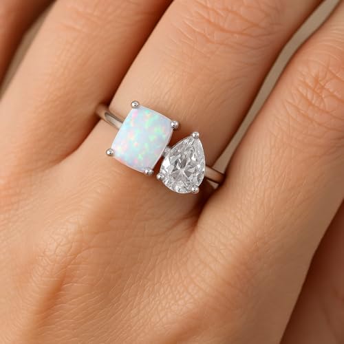Ring size: 4Material: Gemstone, Sterling SilverMetal type: Sterling SilverGem type: Created Opal, Created MoissanitePREMIUM DESIGN: Stunning two-stone ring featuring a 9x7mm emerald-cut opal paired with a pear-shaped diamond in sterling silver with rhodium finishVERSATILE STYLE: Perfect for engagements, anniversaries, or special occasions, this vintage-inspired ring combines classic elegance with latest flairCUSTOMIZATION: Available in US sizes 4-12 with personalization options to create your perfect piece of jewelrySTONE DETAILS: Features an iridescent opal with rainbow-like play of color alongside a brilliant pear-cut diamond for maximum sparkleQUALITY CRAFTSMANSHIP: Expertly cast in 925 sterling silver with secure prong settings to protect and showcase both stunning gemstones Perfect for everyday use. superior materials and excellent craftsmanship ensure long-lasting durability.