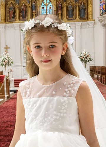Floral Fall First Communion Flower Girls Bow Wedding Veil White Flower Wreath Pearl Rhinestone Floral Crown 4