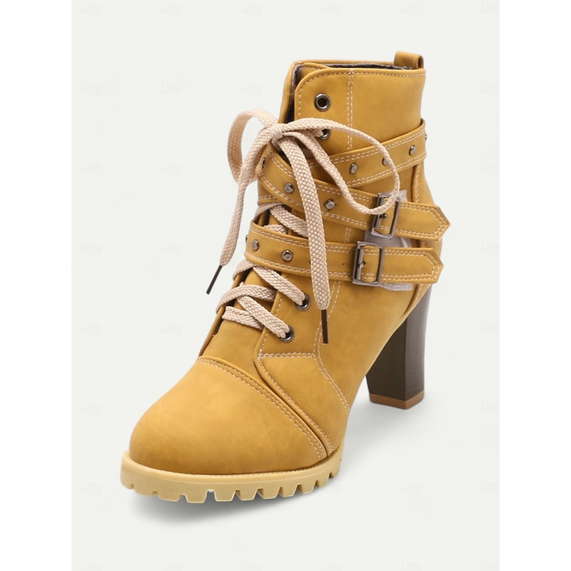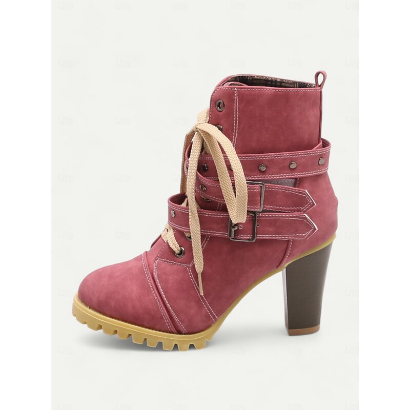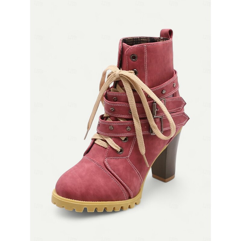 Highlights [Fabric] Crafted from premium suede leather, these ankle boots offer a soft yet durable texture that ensures both comfort and longevity. The interior is lined with synthetic leather and textile, providing added warmth and cushioning during the colder months. [Fit] Featuring a rounded toe design, these boots promise comfort all day long, while the chunky heel and platform construction provide a stable and stylish lift. The lace-up front and adjustable buckles allow for a personalized fit, making them perfect for various foot shapes. [Design Highlights] These boots stand out with their rugged, vintage-inspired design, embellished with rivets and buckles for a biker-chic look. The elegant wooden high heel paired with a side zipper makes them not only stylish but also easy to put on and take off. The outer sole's thick ribbed pattern offers excellent traction across different surfaces. [Occasions] Perfect for daily wear or work settings, these versatile boots are ideal for casual and semi-formal occasions. The bold green color serves as a fashion statement, making them an excellent addition to your fall and winter wardrobe. [Size] Available in sizes ranging from US5.5 to US10.5, it's advised to choose your usual size for the best fit. Suitable for spring, fall, and winter, these boots reflect the 2024 trend of retro and biker styles.