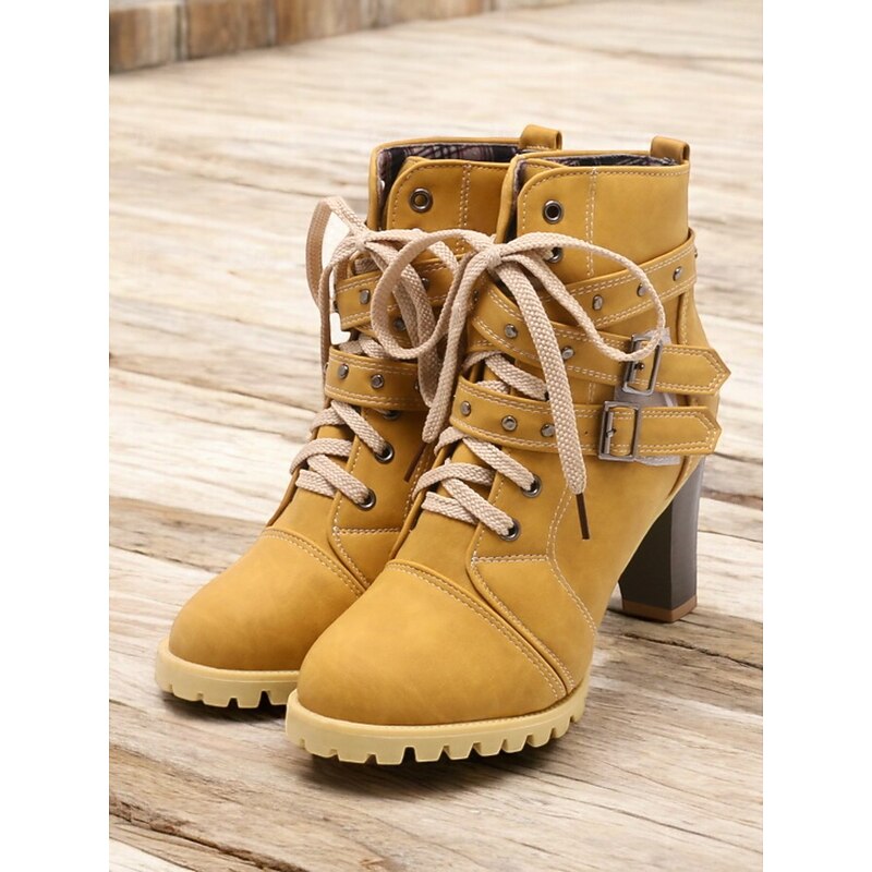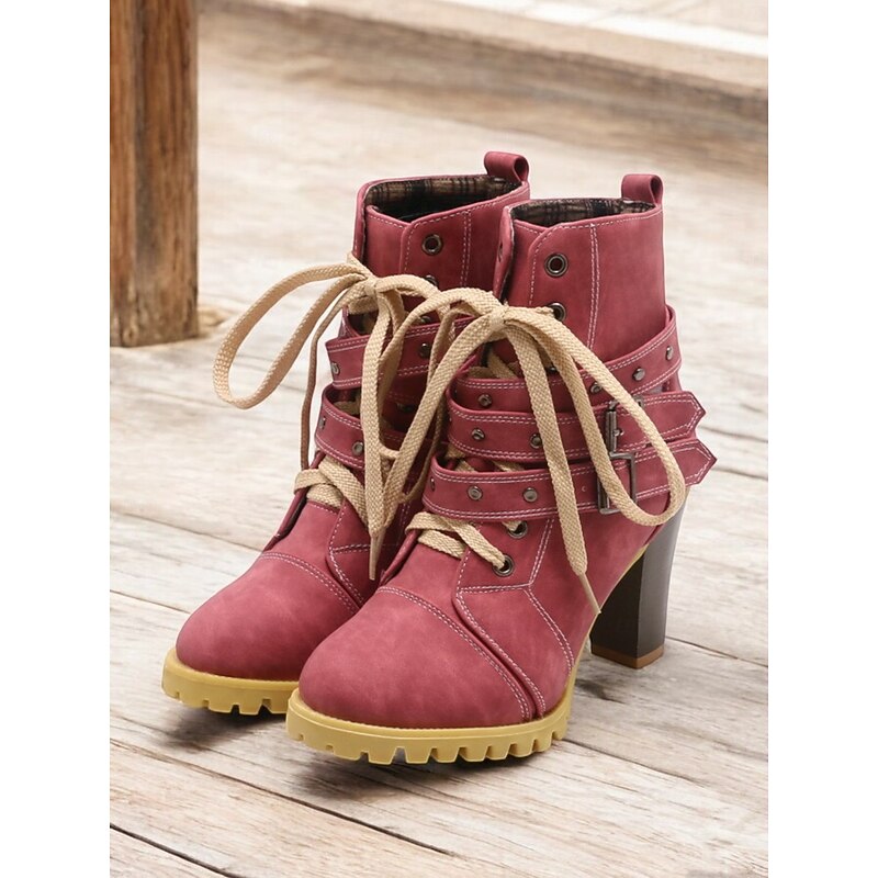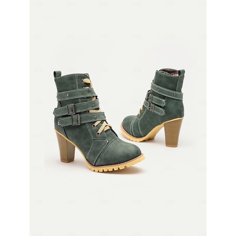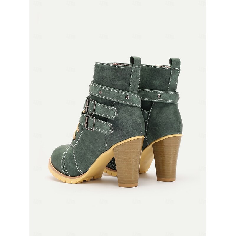 HOT ! Women's Green Buckle Strap Lace-Up Ankle Boots – Chunky Heels and Rugged Sole for Casual and Fall/Winter Fashion
