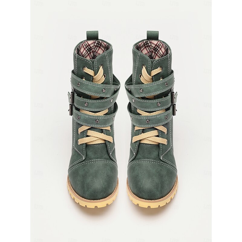 Women's Green Buckle Strap Lace-Up Ankle Boots – Chunky Heels and Rugged Sole for Casual and Fall/Winter Fashion 2