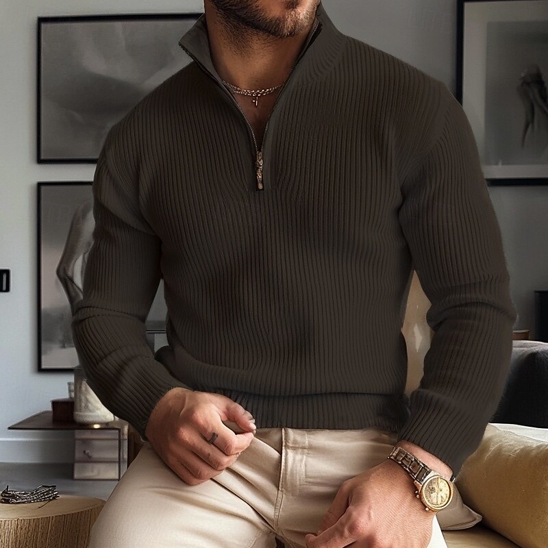 trending ! Men's Sweater Zip Sweater Quarter Zip Sweaters Ribbed Chunky Knit vintage Half Zip Solid Color Stand Collar Elegant Vintage Formal Home Clothing Apparel Bishop Sleeve Fall Winter Black Khaki M L XL