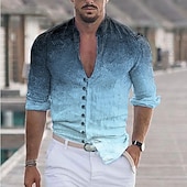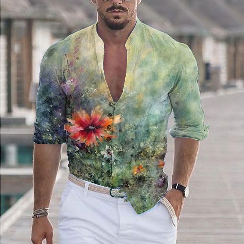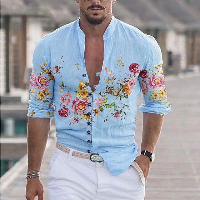 Featuring a stand collar, this shirt incorporates graphic floral prints in a variety of vibrant colors including blue, green, white, black, pink, yellow, and light green. The button-up front adds a classic touch, while the long sleeves offer versatility—roll them up for a more casual look.
