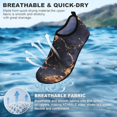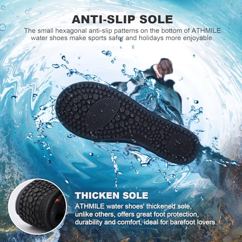 Sole material: RubberOuter material: 92% polyester+8% spandex UpperClosure type: Pull-OnQuick Dry: Water shoes for women and men choose the proportion of materials that can better maintain the elasticity of the fabric while taking into account the better breathability. Our women and men outdoor swim socks shoes can be dried in the sun as quickly as 3 hours.resilient Non-slip Sloe Design: The anti-slip design of bionic honeycomb hexagonal particles can maximize the anti-slip effect. We also choose more wear-resistant and thickened rubber soles, providing great traction on every step, great for all kinds of water pool aqua play, protecting feet from getting hurt by sharp objects like little rock,shell,etc.Occasions: The aqua socks shoes of summer stuff are suitable for beach, swimming, cruise,yoga, camping essentials,surfing,pool, lake fishing, water park,boating, camping and other outdoor traveling activities.Lightweight Senseless Beach Shoes: Thanks to our materials and stitching technology, each pair of our swim shoes are lightweight, flexible and foldable,really easy to put on and carry out. Compared with ordinary beach aqua socks,the special thick sole design can effectively help the upper not easy to be damaged and more durable.Various style and size: There are a variety of colorful styles for you to choose. And our barefoot shoes of beach accessories have lots of size suited for men,women,boys,girls, such as size 8 9 10 11. Please choose a half size up if your foot is wide. Perfect for everyday use. superior materials and excellent craftsmanship ensure long-lasting durability.