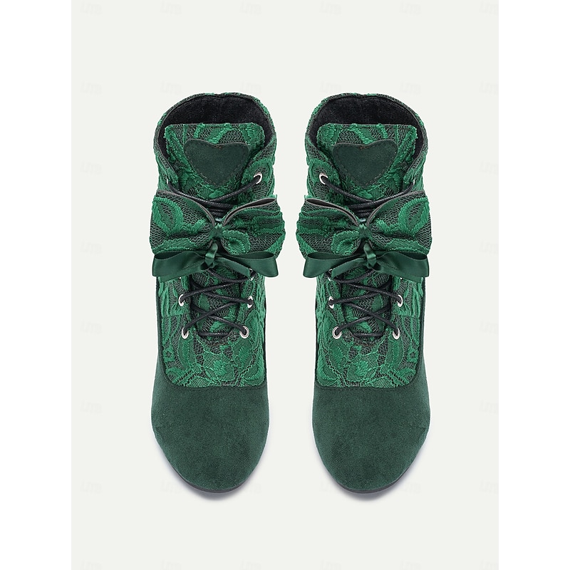 : Featuring front lace-up closure with decorative ribbon ties, these boots allow for an adjustable, personalized fit. The intricate floral lace design adds a touch of femininity, while the round toe shape maintains a classic and timeless appeal.