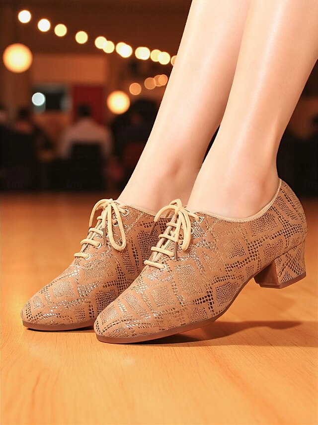 Women's Beige Lace-Up Ballroom Dance Shoes - Low Heel Oxford Style Glitter Pattern Pumps for Professional Dance Party & Performances 1