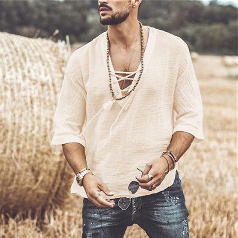 More information about Men's T Shirt Tee Tee Top Half-Sleeve V Neck Spring & Fall Plain Fashion Designer Basic Lace up Vacation Street Going out Apricot Black White Top Tee for Men