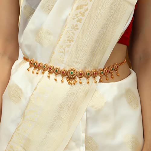 trending ! Gold Plated Waist Belt For Women Red & Green Stone Studded Bridal Kamarbandh flawless Kamarpatta For Weddings, Karwachauth & Festive Gifting