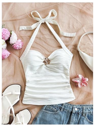HOT ! SOLY HUX Girl's Summer Ruched Halter Top Metal Decor Tie Back Sleeveless Tank Cute Vacation Tops