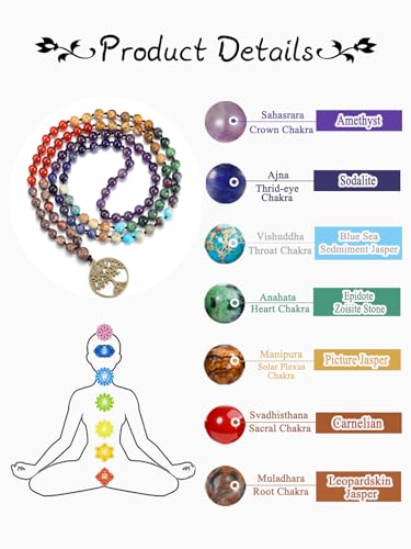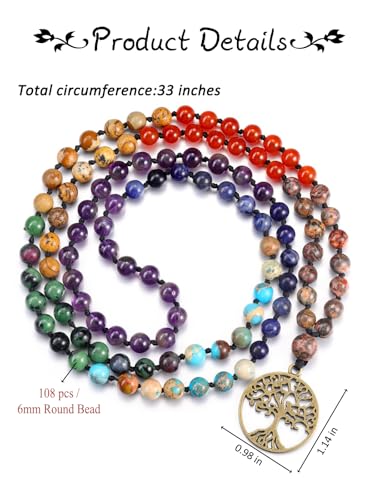 • MALA BEADS NECKLACE: The necklace made of 108 pcs natural 7 chakra healing crystal 6mm beads, which match with life tree pendant, excellent jewelry luster and tenacity. It can be a pendant necklace or wrap around the wrist as crystal beads bracelet, mala beads aids for yoga meditation and spiritual growth.