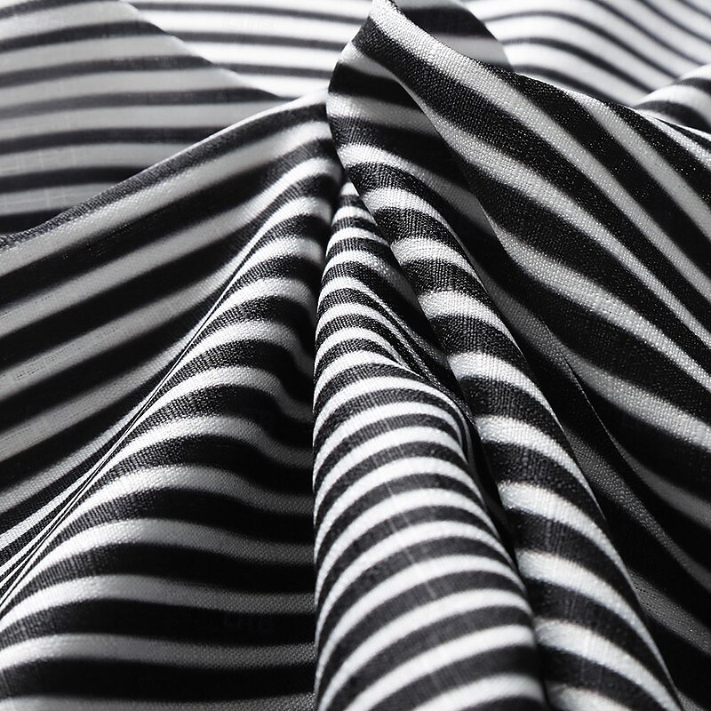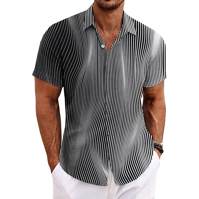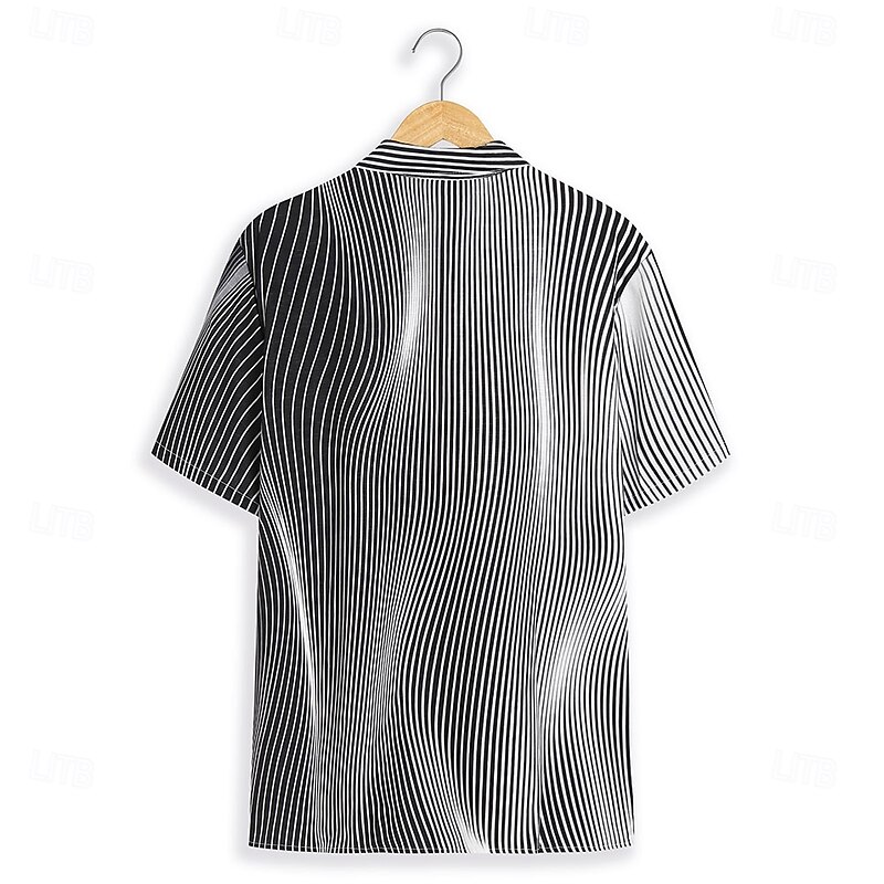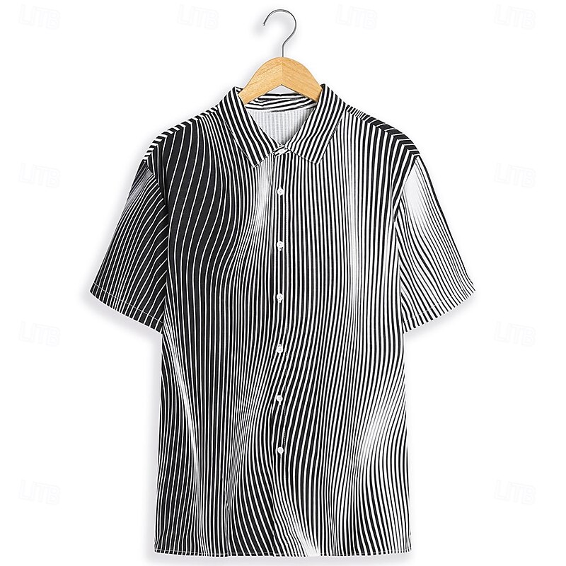 Highlights [Fabric:] Crafted from high-quality polyester, this men's shirt provides a soft, breathable, and lightweight experience, making it perfect for warm spring and summer days while ensuring lasting comfort. [Fit Type:] The shirt offers a regular fit tailored to enhance comfort and style, ensuring ease of movement for any occasion, from leisurely outings to more structured settings. [Design Highlights:] Featuring a distinguished black and white geometric pattern with vertical stripes, this shirt creates a striking optical illusion effect. The classic turndown collar and button-down front lend a timeless appeal, seamlessly blending modern design with sophisticated elegance. [Occasions:] Ideal for a range of events, this versatile piece works for outdoor adventures, casual gatherings, and even semi-formal occasions. Pair it with tailored trousers for a polished look or casual shorts for a relaxed vibe, adapting effortlessly to any setting. [Size Range:] Available in a variety of sizes from S to 3XL, this shirt caters to a wide range of body types, ensuring a comfortable and flattering fit for everyone.