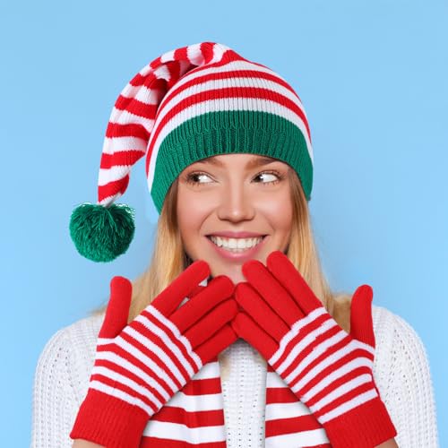 • Festive Christmas Theme: these Christmas hats, knitted striped scarves, and Christmas gloves sets feature vibrant and festive designs to make you feel happy of Christmas. The red, white, and green color scheme, coupled with classic stripes and cute pompoms, embodies the essence of the holiday season