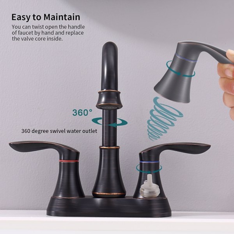 Highlights 1. Item Weight: ‎3 pounds 2. Package Dimensions: 14.1x7.2x4 inches 3. Color: ‎Oil-Rubbed Bronze 4. Style :‎contemporary 5. Finish: ‎Oil Rubbed 6. Material:Plastic casting 7. Number of Handles ‎2 8. Handle Material :Zinc 9. Plug Profile: ‎Deck Mount 10.Batteries Required? ‎No One set of main part and accessories 1. OVERALL MEASUREMENTS: Height:10.06"; Spout Height:4.99"; Spout Reach:4.69". 2. MODERN DESIGN: Two-Handle installation for effortless flow and water temperature control. 3. PREMIUM QUALITY: Solid brass plastic casting body construction ensures rugged use 4. ACCESSORIES: Hot and cold flexible hoses(23.6 inch long) and pop up drain are included