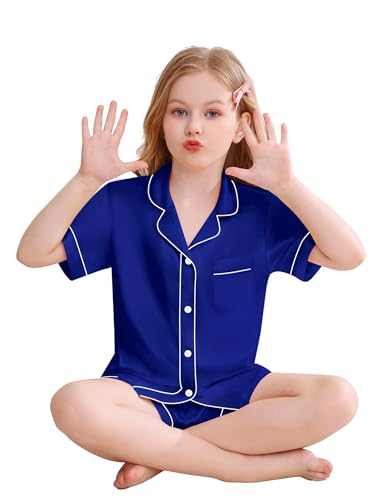SWOMOG Kids Silky Satin Pajamas Set Girls Boys Button-Down Sleepwear Short Sleeve 2 Piece PJs Sets Lounge Sets 2