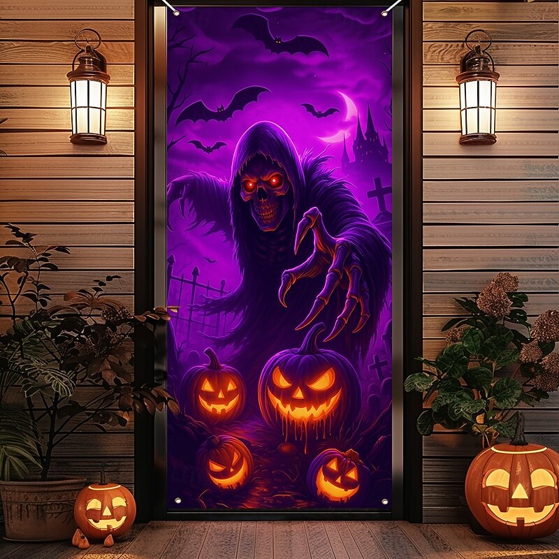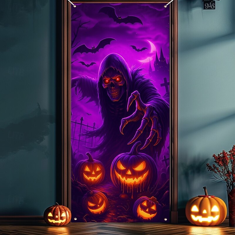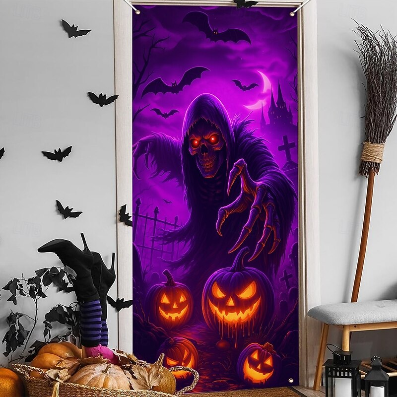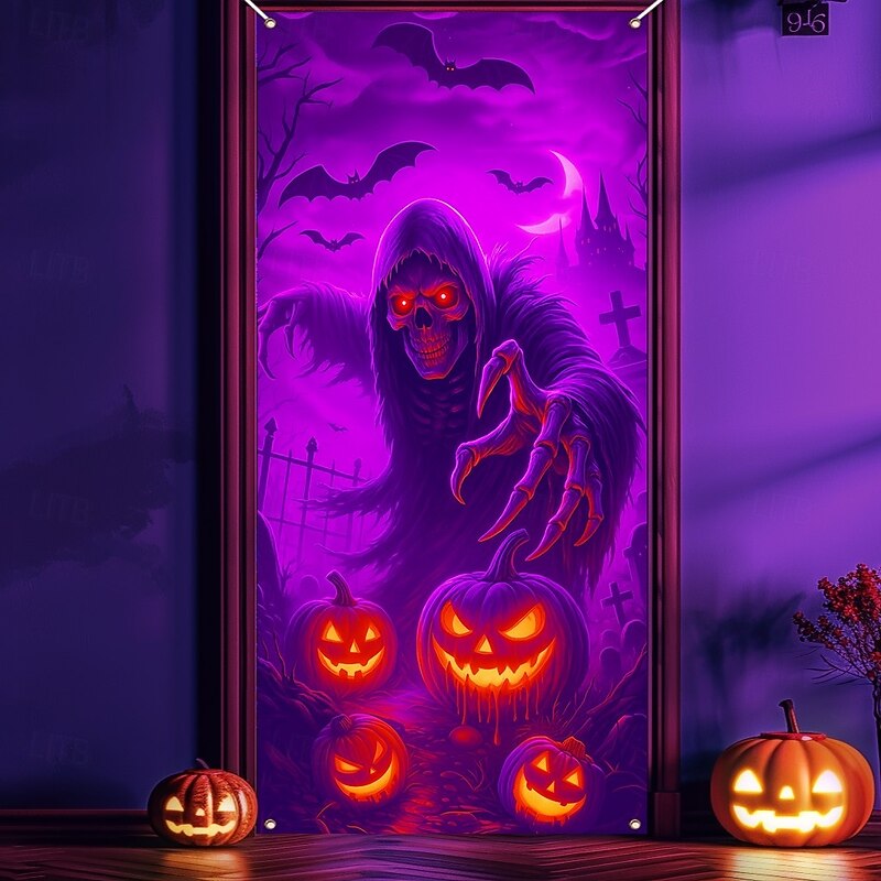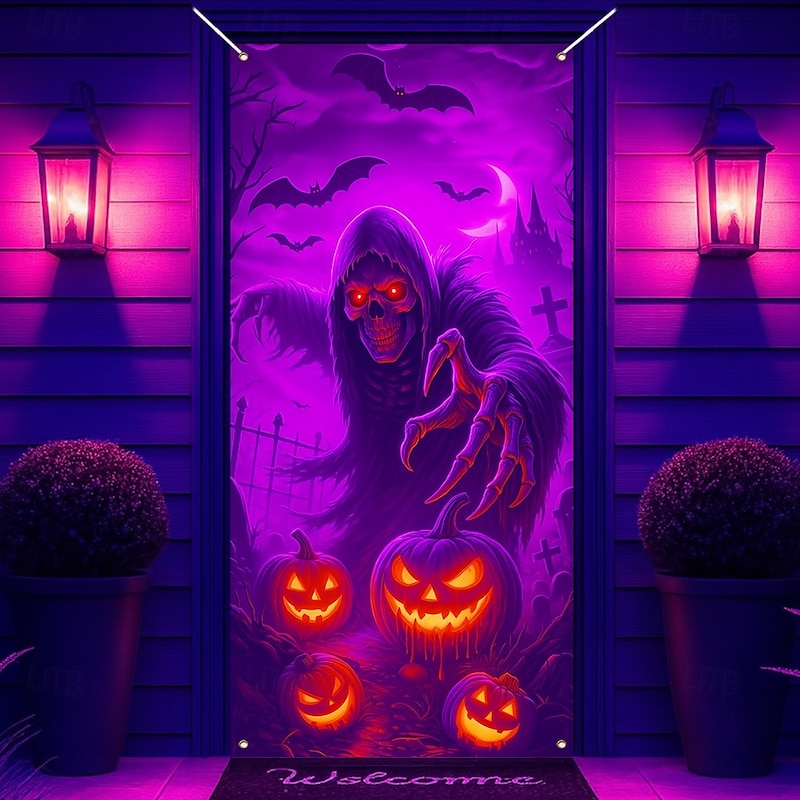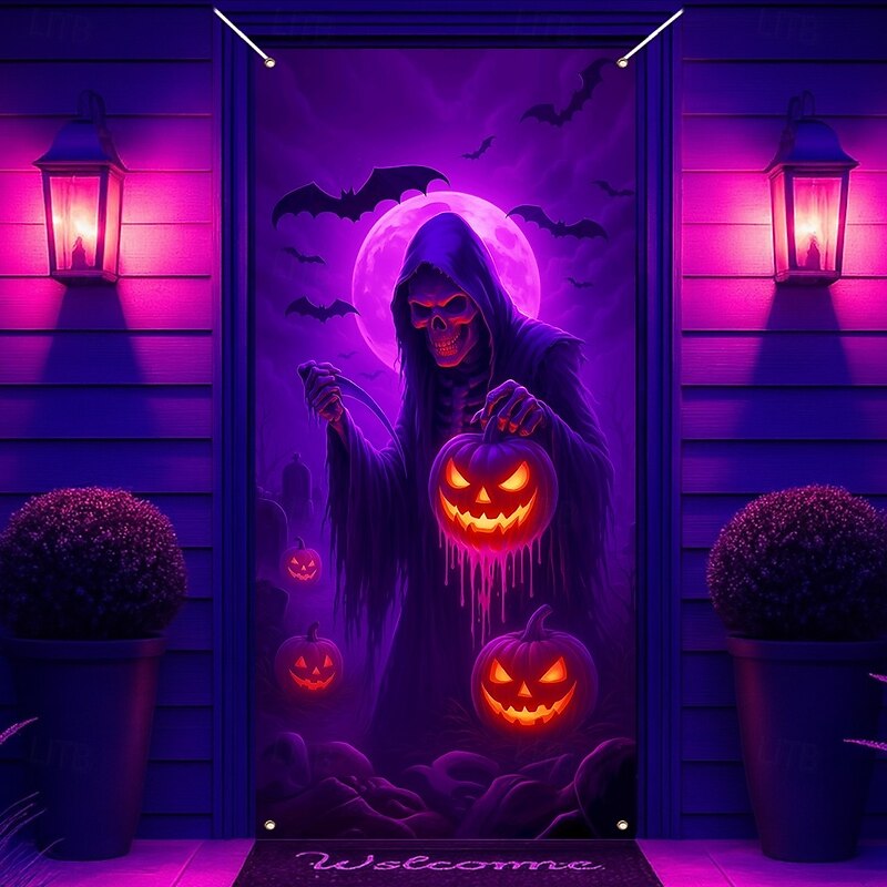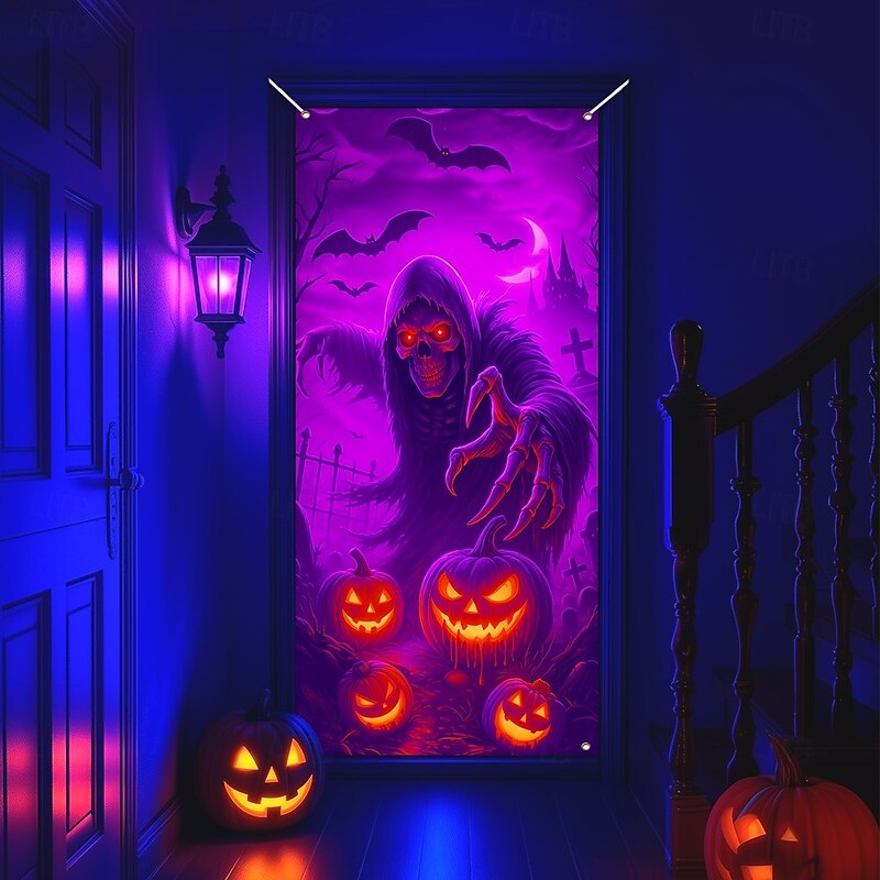 $18.99 - Halloween Door Cover Neon Grim Reaper with Pumpkins Banner, Glowing Blacklight Entrance Decoration for Outdoor & Indoor 2025 Halloween Bedroom, Living Room, Bathroom 2025. Shop for cheap Halloween Door Covers online? Buy at lightinthebox.com on sale today!