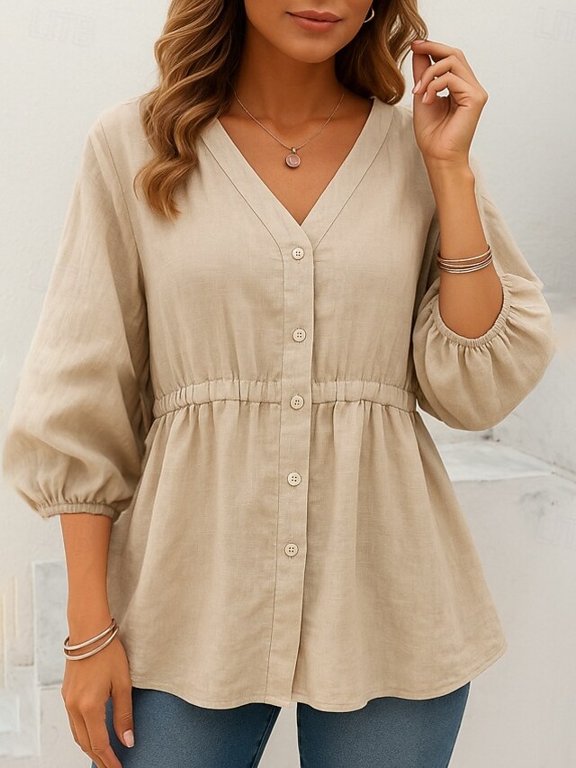 Why Choose Women's Cotton Linen Shirts Solid Color Basic Casual 3/4 Length Sleeve V Neck Regular Tops Daily Buttons Blue Khaki Apricot Summer Spring?