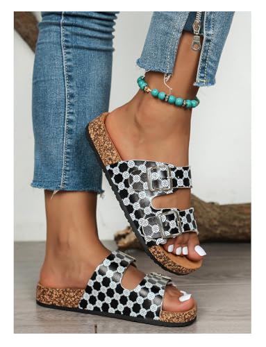 Geerta Women Slide Sandals Checkered Open Toe Adjustable Flat Comfort Slip On Slippers for Summer Business Office Standing All Day Lightweight Running 5
