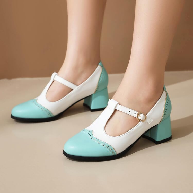 Women's Round Toe T Strap Mary Janes Square Heel Pumps 6