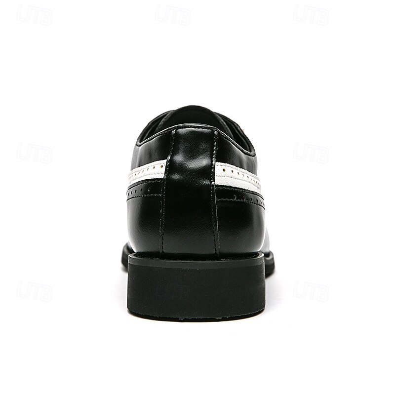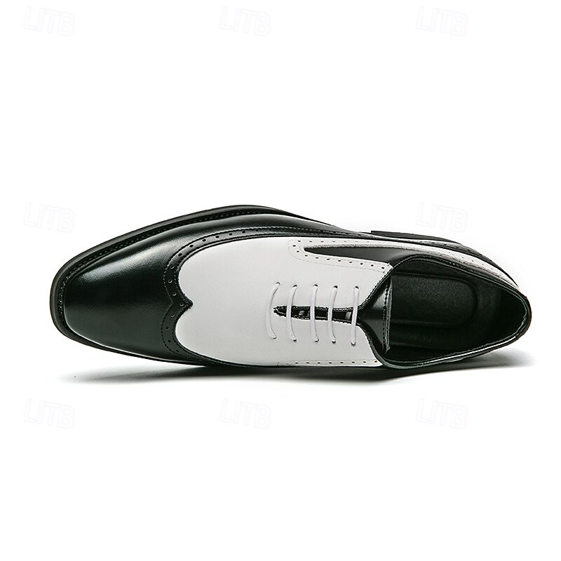 Highlights [Fabric] These men's oxford shoes are crafted from high-quality PU leather, providing durability and a sleek, sophisticated look. The material ensures breathability and comfort, making them suitable for prolonged wear. [Fit] Featuring a classic round toe and sleek silhouette, these oxfords offer a comfortable fit while maintaining a sharp and stylish profile. The lace-up closure allows for a customizable fit, providing both security and ease. [Design Highlights] The shoes boast a timeless two-tone design in black and white, accentuated by intricate brogue detailing along the edges. The low heel offers subtle elevation without compromising on comfort, while the rubber outsole enhances slip resistance. [Occasions] Perfect for formal events, business meetings, and vintage-inspired outfits, these versatile oxfords add a touch of elegance and refinement to any ensemble. Whether dressing for an important presentation or a special occasion, these shoes ensure you'll make a memorable impression. [Size Range] Available in sizes US7 to US11, these shoes cater to a range of foot dimensions, ensuring an excellent fit for various wearers.