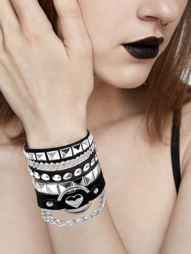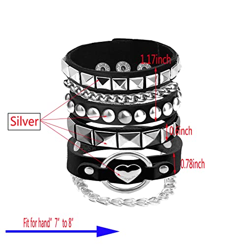 3Pcs Soft Leather Bracelets with Heart/Pyramid/Chain, Emo Punk Wrap Wrist Cuffs Jewelry Accessories Gothic Gift for Vintage Women 7
