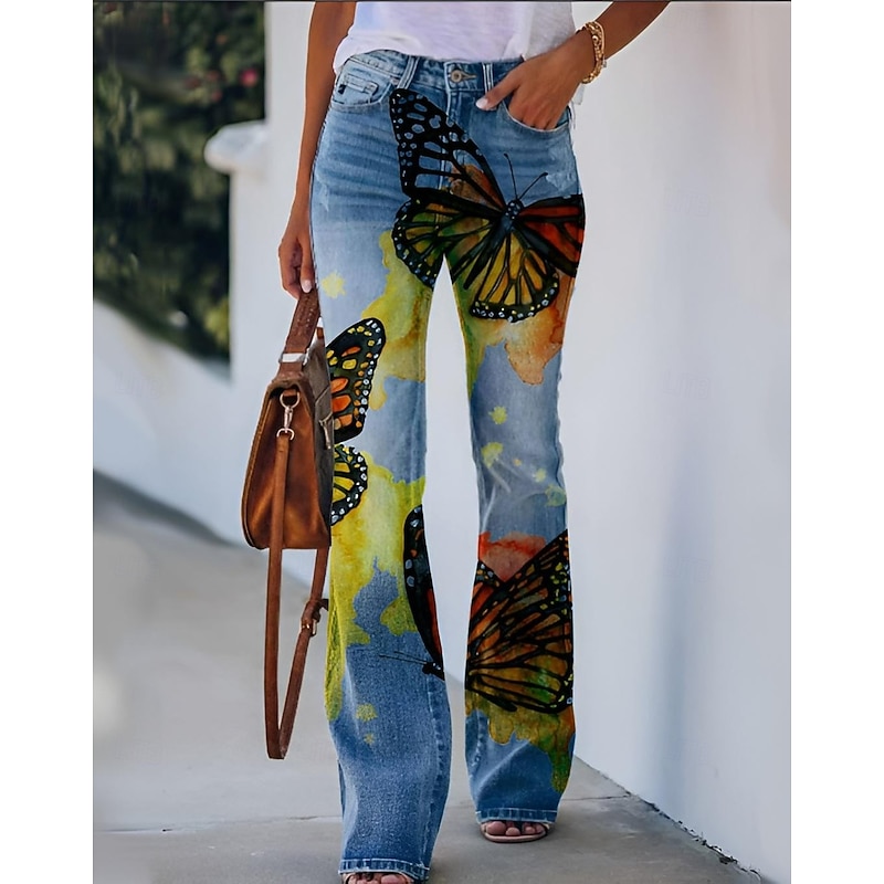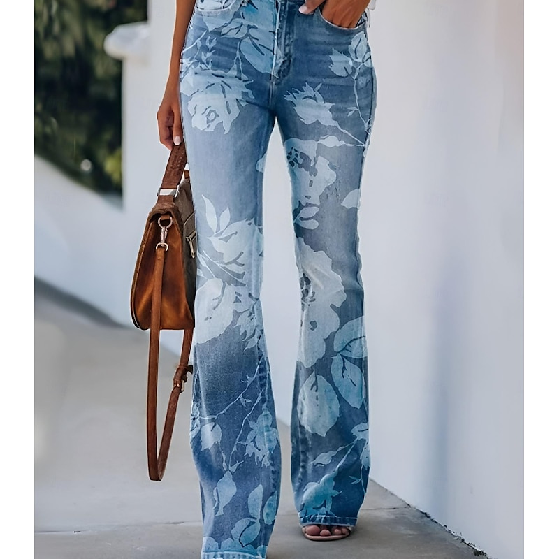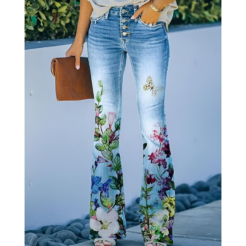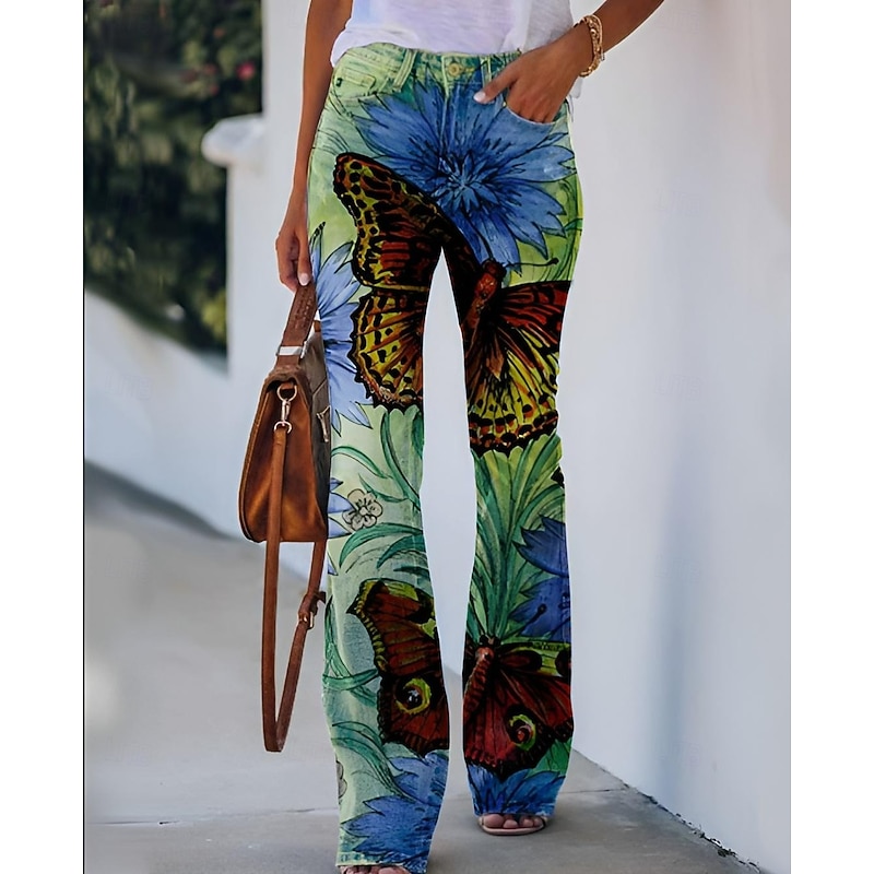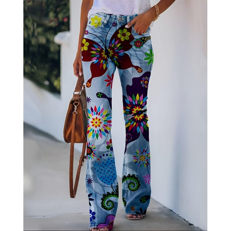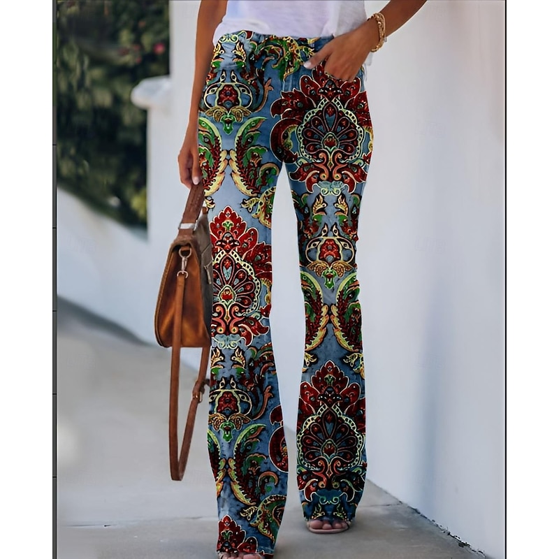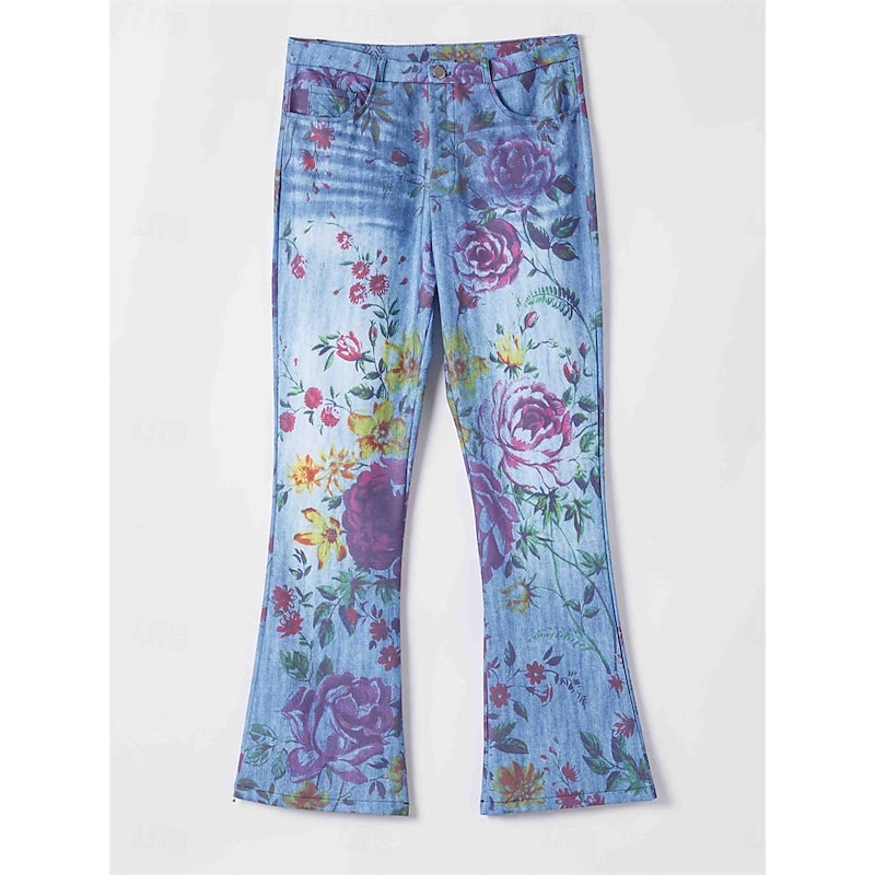 HOT ! Women's Flared Pants Bell Bottom Pants Trousers Fashion Full Length Mid Waist Skull Flower / Floral Side Pockets Wide Leg Print Comfort Micro-elastic Halloween Weekend Navy-blue Rainbow Sky Blue And
