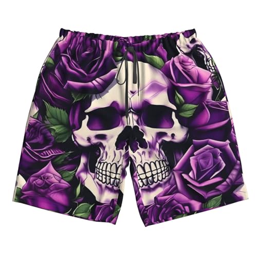 Many Purple Rose Skull Men's Flower Print Beach Shorts,Mens Swim Trunks Quick Dry Beach Shorts,Hot Summer Swim Trunks 4