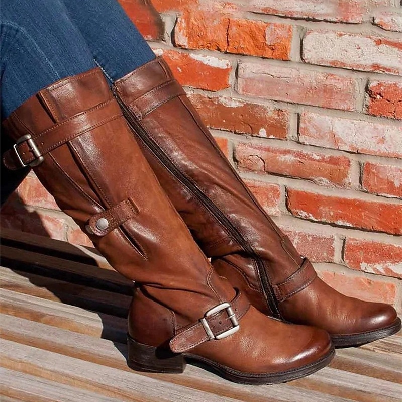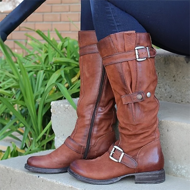 HOT ! Women's Purple Faux Leather Knee-High Boots with Buckle Straps and Side Zipper, Vintage Style Motorcycle Boots for Outdoor and Casual Wear