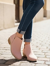 HOT ! Women's Pink Faux Leather Low Heel Ankle Boots - Western Style Slip-On Booties for Casual and Everyday Wear