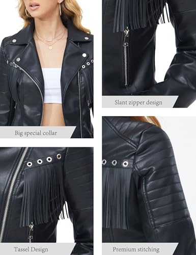 • STYLE: Classic short moto-inspired faux leather jacket featuring a lapel collar, asymmetrical zipper closure, and eye-catching tassel trim details
