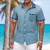 More information about Men's Geometric Plaid Grid Pattern Linen Shirt Summer Shirt Button Up Shirt Short Sleeve Fashion Casual Vacation Holiday Beach Wear Summer Spring Turndown Collared Shirts Front One Pocket Blue