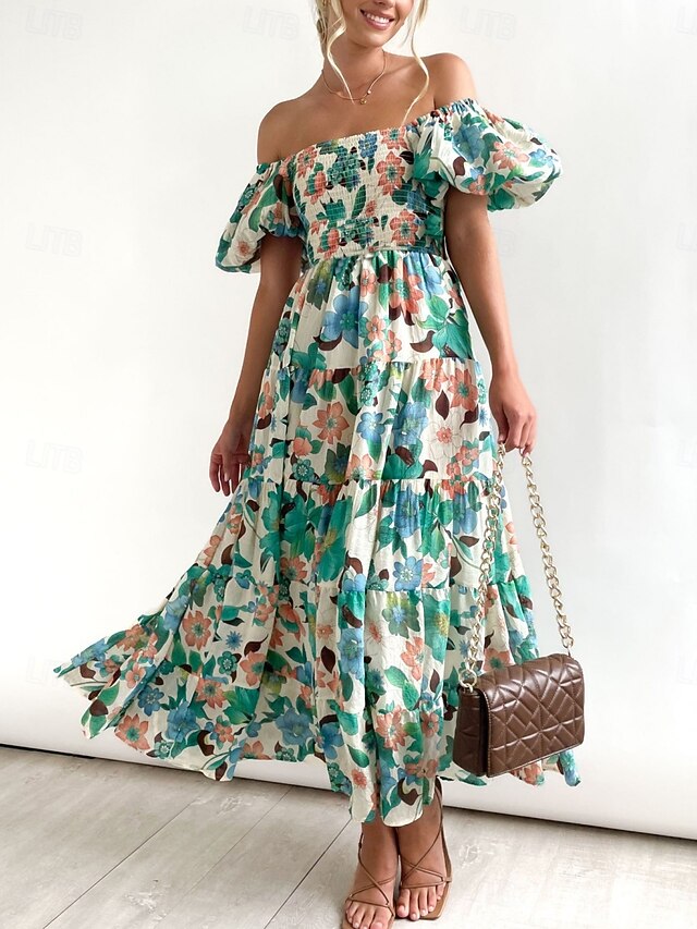 Women's Maxi Dress Casual Dress Swing Dress A Line Dress Stylish Casual Vacation Daily Regular Fit Floral Short Sleeve Off Shoulder Blue Green Summer 2