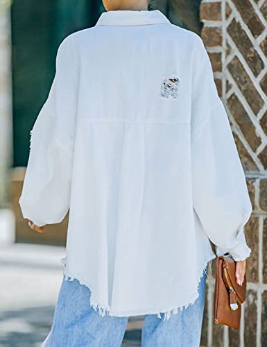 Lumister Womens Causal Oversized smooth Lightweight Distressed Jean Jacket Ripped Fringe Long Sleeve Denim Jacket Shacket