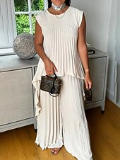 trending ! Women's Active Blouse Pants Sets Sleeveless Crew Neck Solid Color Ruched Holiday Daily Wear White Blue Brown Summer Regular Fit