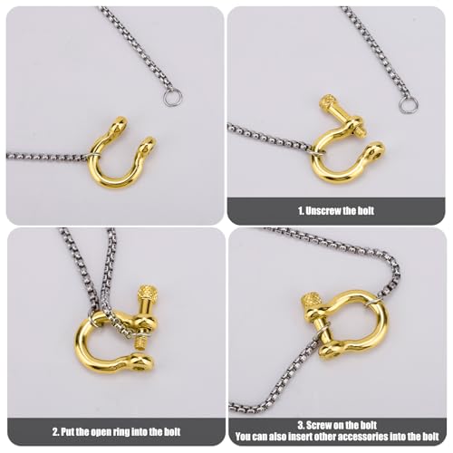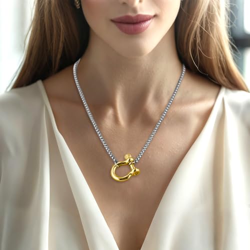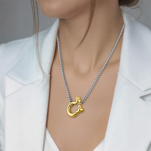 Carabiner Necklace, 18.7 in Two Tone Buckle Pendant Necklace Charm Silver Stainless Steel with Heavy Screw Anchor Shackle Foxtail Chain Jewelry for Women Men