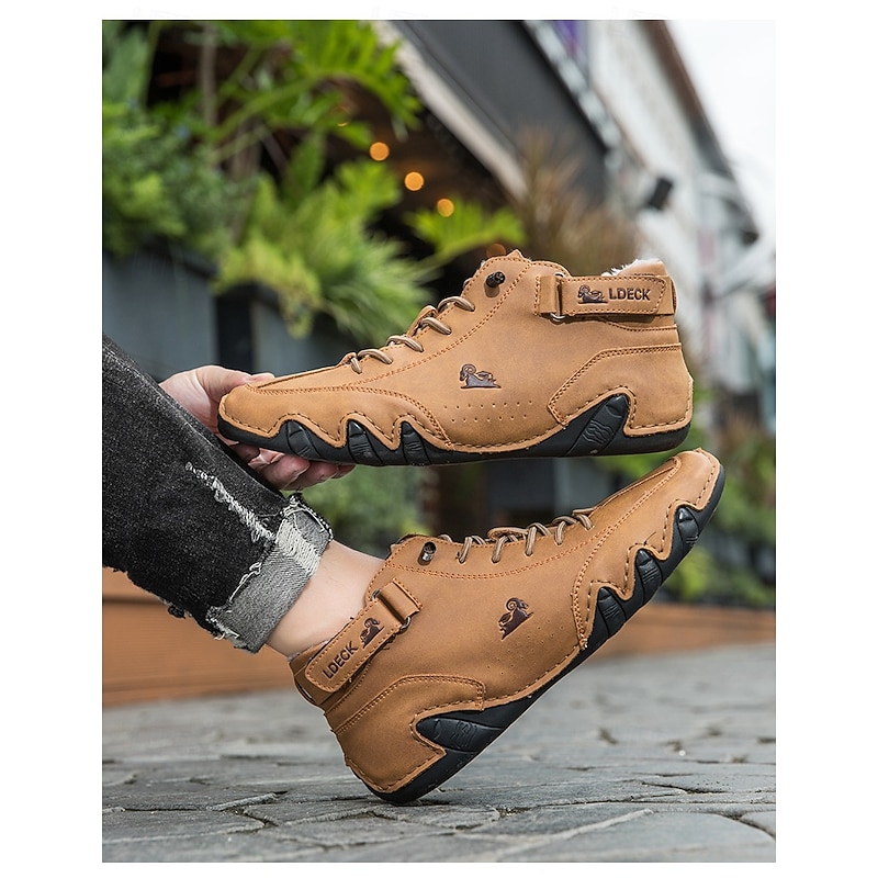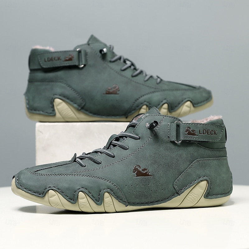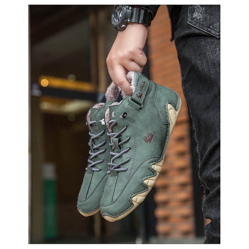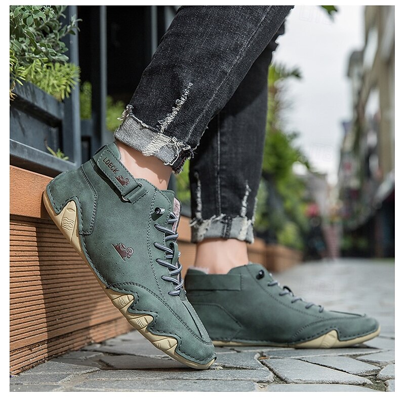 Highlights [Men's Vintage Green Faux Suede Lace-Up Ankle Boots] : Crafted in a sophisticated microfiber material, these vintage-inspired boots offer a sleek and durable choice for your outdoor adventures. The high-top design ensures a comfortable and snug fit, while the round toe shape adds a classic touch to the overall look. [Warm Fleece Lining and Unique Design Elements] : The interior features a plush fleece lining for excellent insulation, keeping your feet warm and comfortable during colder days. These boots are designed with a lace-up closure system enhanced by an additional fastening strap, offering both a secure fit and a modern twist on a timeless style. [Versatile and Stylish Outdoor Footwear] : With their slip-resistant rubber soles, these boots provide enhanced grip and stability on various surfaces, making them perfect for casual outdoor activities or day-to-day wear. Their elegant hand-stitched detailing elevates the overall aesthetic, combining functionality with style effortlessly. [Perfect for a Blend of Style, Comfort, and Functionality] : Suitable for those seeking a versatile addition to their footwear collection, these boots are designed for comfort and performance in any setting. They are ideal for casual gatherings, weekend outings, or urban adventures. [Size Range] : Available in a wide range of sizes from US6-6.5 to US13.5, ensuring a suitable fit for a variety of foot sizes. With multiple color options such as White, Black, Gray, Green, Pink, Light Blue, Light Brown, Khaki, and Dark Green, there's a design to match your personal style. Perfect for everyday use. superior materials and excellent craftsmanship ensure long-lasting durability.
