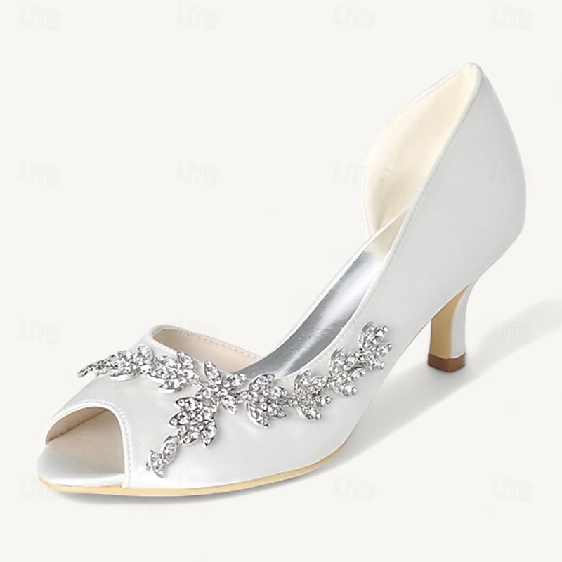 Highlights [Material] : Crafted from luxurious satin, these wedding shoes offer a soft and elegant finish, providing a sophisticated touch to any bridal ensemble. [Style] : With a classic peep-toe design, the shoes feature a kitten heel for a comfortable yet contemporary option, blending grace with practicality. [Design Highlights] : Intricately embellished with rhinestones in a stunning leaf pattern, these shoes exude opulence. The soft lining ensures comfort for extended wear, while the loafer closure offers secure fitting and ease of wear. [Occasions] : Perfect for weddings, formal events, and other special occasions, these shoes add a touch of glamour and elegance, making them an ideal choice for any memorable event. [Size Range] : Available in a wide range of sizes, from US5 to US11.5, ensuring a perfect fit for different wearers. Perfect for everyday use. superior materials and excellent craftsmanship ensure long-lasting durability.